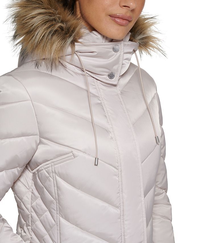 Kenneth Cole Womens Faux-Fur-Trim Hooded Puffer Coat Medium Birch Light Tan