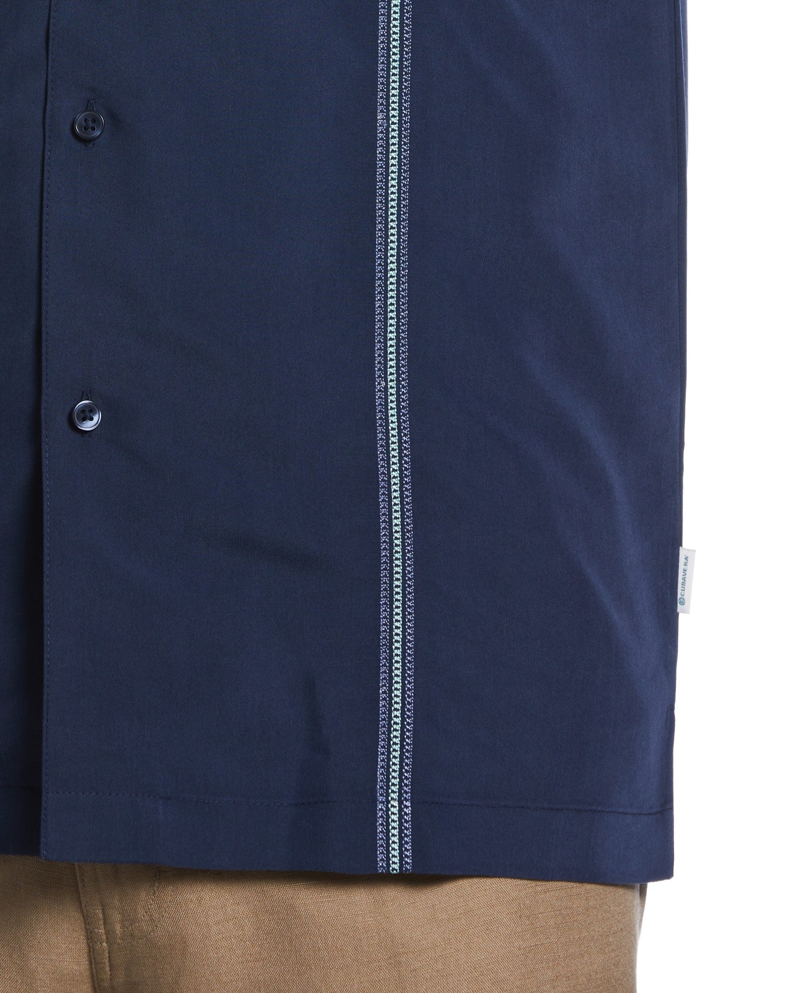 The Cubavera Men's Palm Tree Embroidered Button-Down Camp Shirt in Dress Blue is the perfect addition to your warm-weather wardrobe. This stylish shirt features a subtle palm tree embroidery, giving it a relaxed yet sophisticated look. Made from a comfortable blend of cotton and polyester, it is lightweight and breathable. Whether you're heading to the beach or out for a casual dinner, this shirt will keep you looking sharp and feeling cool.