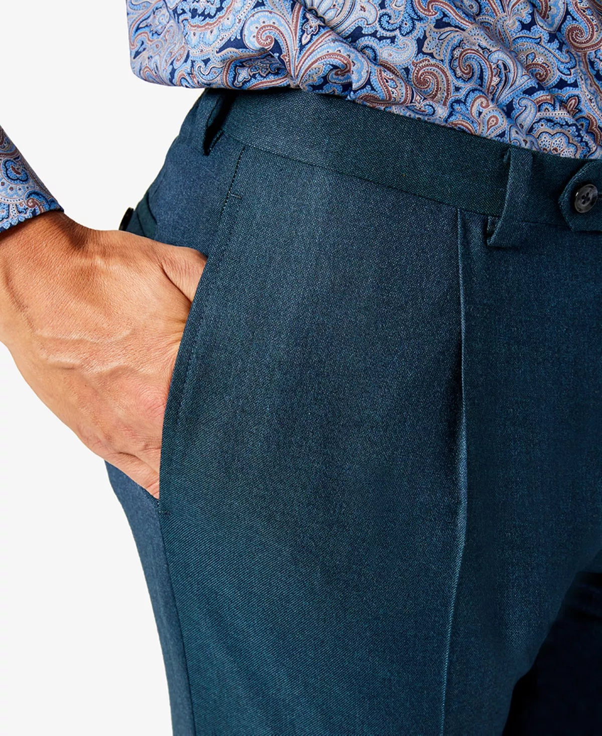 These Tallia men's classic-fit wool suit separate pants in dark teal are a timeless addition to any wardrobe. Crafted from high-quality wool, they offer a sophisticated and polished look. The classic-fit design provides a comfortable and relaxed feel, allowing for ease of movement. The dark teal color adds a touch of distinction and uniqueness to your outfit, making it suitable for both formal and semi-formal occasions. These pants can be paired with a matching suit jacket or worn separately for a more casual yet refined look. With their impeccable tailoring and luxurious fabric, these pants are a must-have for the modern man seeking elegance and style.