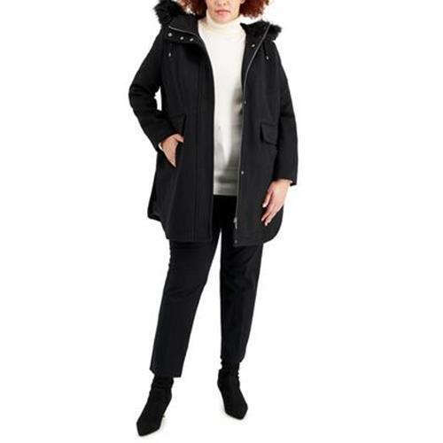 Calvin Klein Women's Plus Size Hooded Faux-Fur-Trim Coat 1X Black Wool Zip