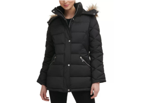 Get cozy in this seriously stylish puffer coat from Calvin Klein, a hooded pick fashioned with gorgeous faux-fur trim and a quilted design.