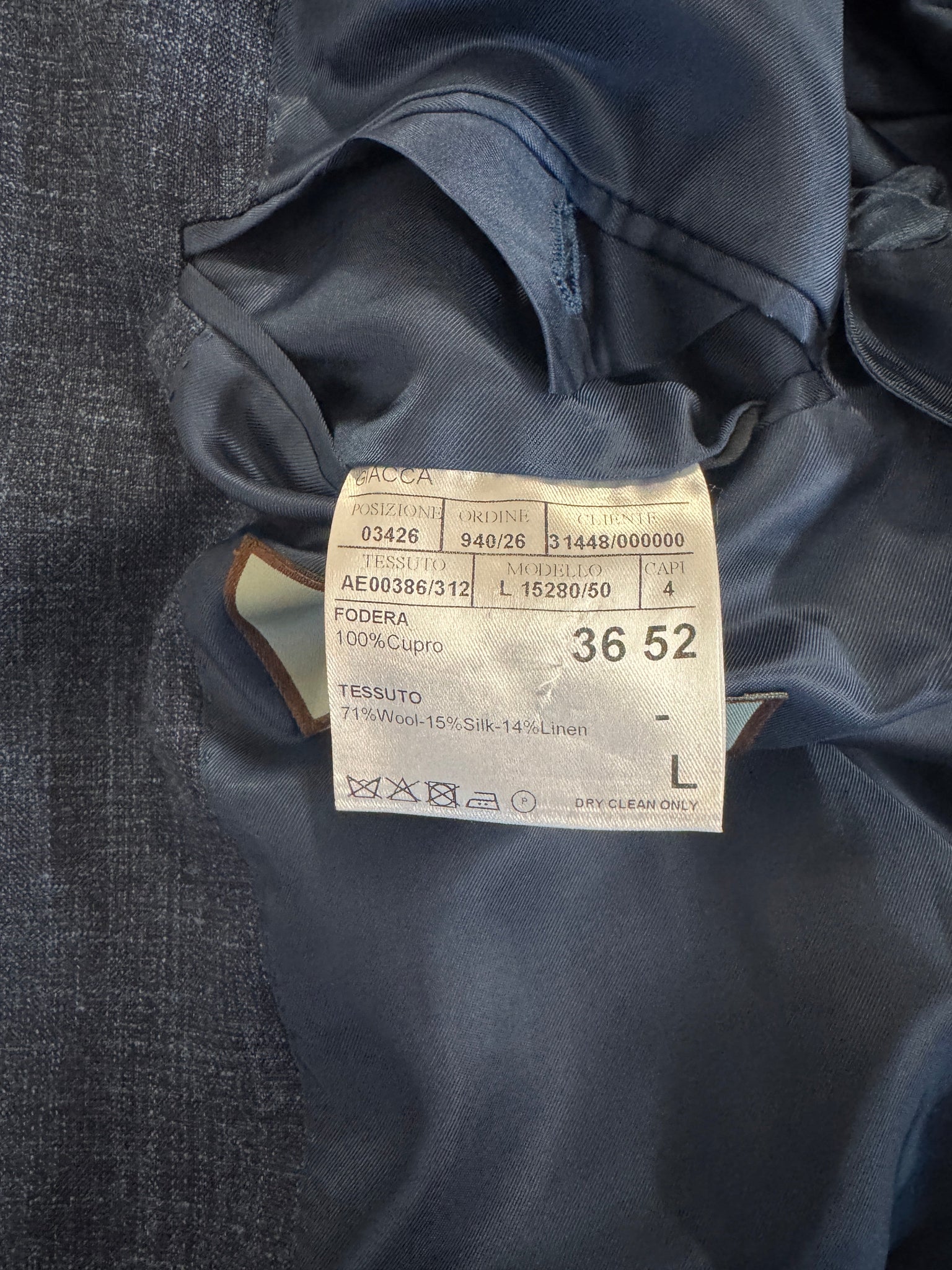 Jacket and pants shell: 71% wool/15% silk/14% linen; lining: 100% cupro