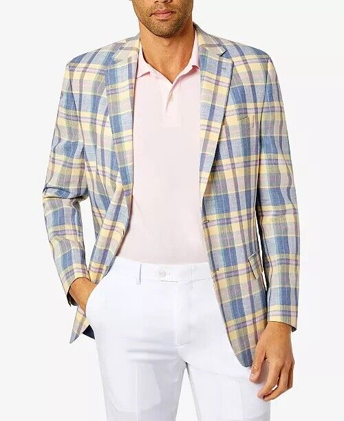 CLUB ROOM Men's Linen Sport Coat Yellow Blue 36S Classic-Fit Plaid