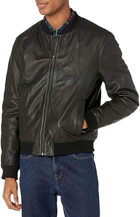Cole Haan Men's Bonded Leather Varsity Jacket Large Black