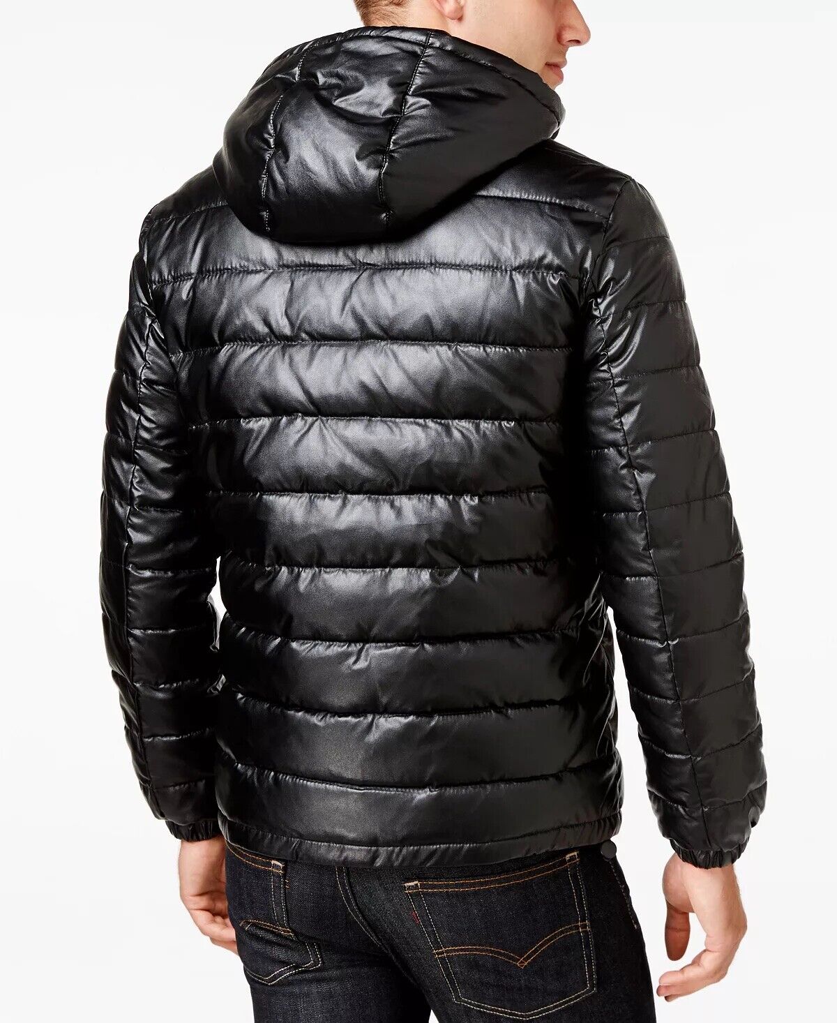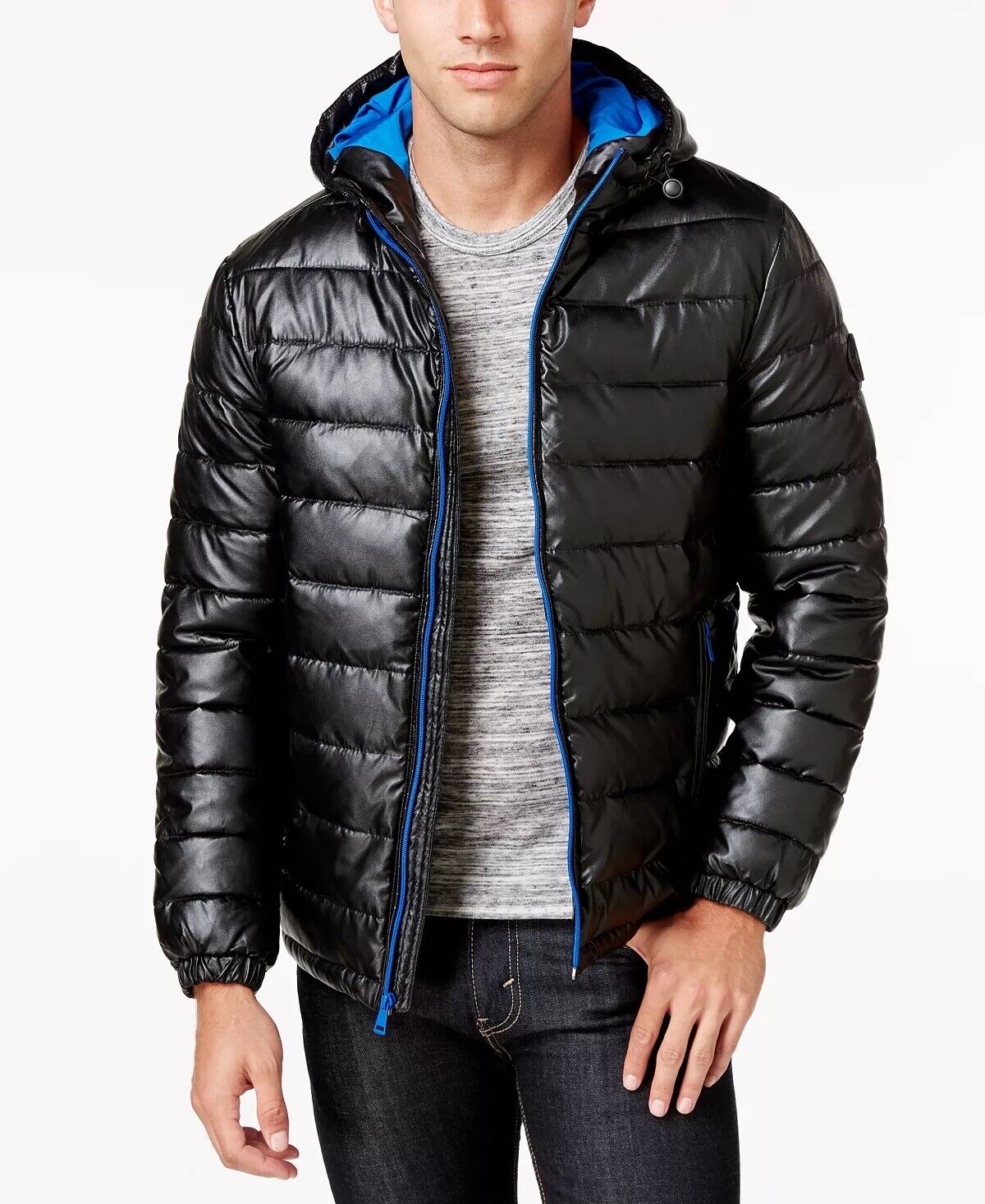 Cole Haan Men's Faux-Leather Puffer Coat Black / Blue Large