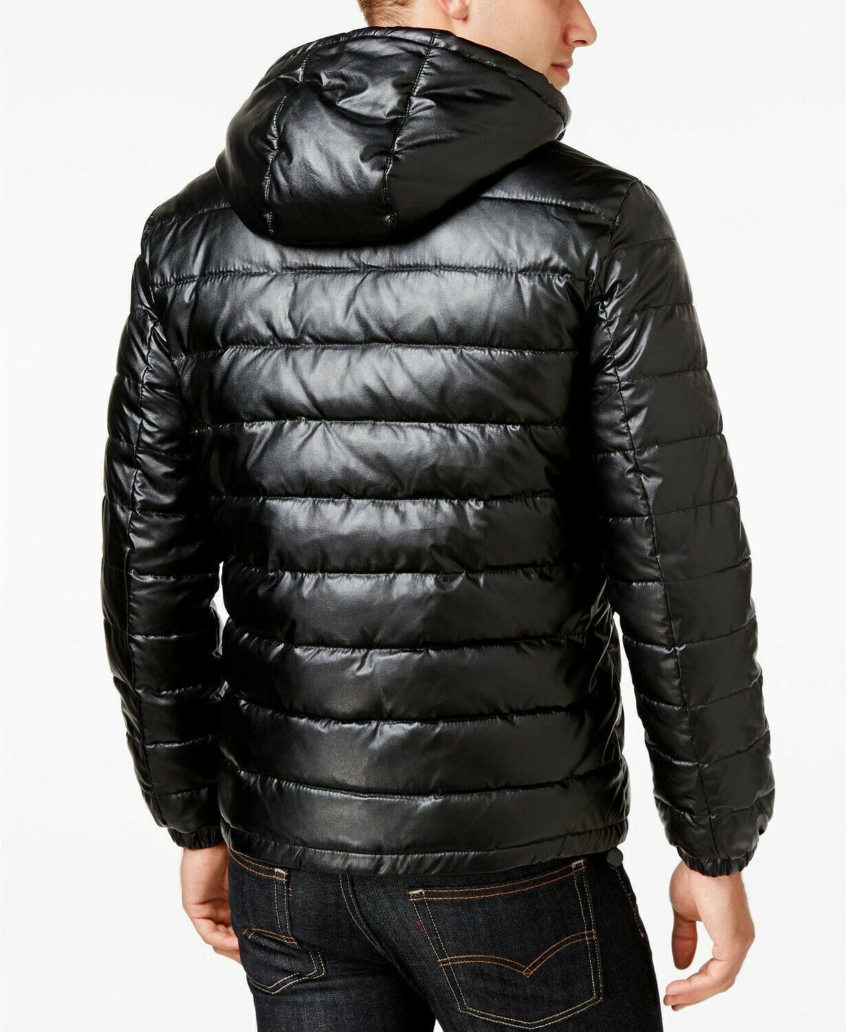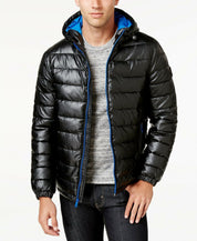 Cole Haan Men's Faux-Leather Puffer Coat Small Black / Blue Trim