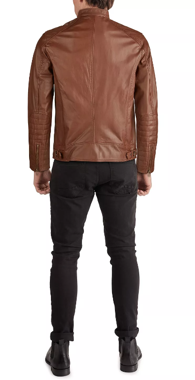 Description: Ribbed arm patches further the rugged demeanor of this leather motorcycle jacket. Button-snap band collar Long sleeves Front zip Front zip pockets One inside slip pocket Zipped cuffs Lining: Cotton/polyester Leather Dry clean by leather specialist Imported SIZE & FIT About 27" from shoulder to hem. Men's - M Outerwear > Saks Off 5th > Barneys Warehouse. Cole Haan. Color: Cognac. Size: XL.