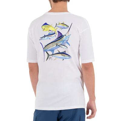 The Guy Harvey Men's Atlantic Big Game Short Sleeve T-Shirt in Medium is a classic white tee featuring an intricate and vibrant marine-inspired design. Made with comfortable, high-quality materials, this shirt is perfect for any outdoor or casual occasion. The iconic Guy Harvey signature adds a stylish touch, making it a must-have for any fishing or ocean enthusiast.