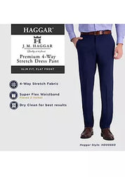 For a polished look with exceptional comfort, choose the contemporary slim fit and unrestrictive 4-way stretch of these stylish dress pants from J.M. Haggar.