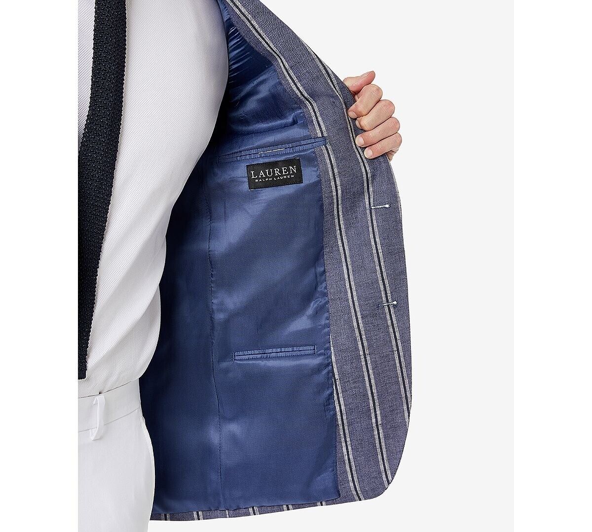 A classic fit and a bold pattern lend a fresh look and feel to this blazer from Lauren Ralph Lauren.Regular fit through the shoulders chest and waist with standard armholes and sleeves; Jacket sizing is indicated by a number and a letter; Number refers to chest size Letter refers to length of Jacket based upon height: S=5'7" and under; R=5'8"-5'11"; L=6' and up; Notched lapel; Two-button closure; four-button cuffs; Two front flap pockets left chest welt pocket; interior welt pockets; Center vent; fully lined; Ultraflex stretch performance; Shell: linen; lining: polyester/viscose; Dry clean; Imported