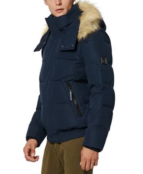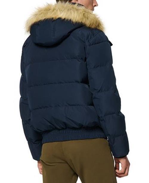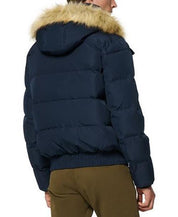 This classic down filled bomber jacket is cut in a water resistant rip stop fabric that helps to protect from the elements and has an attached inner bib for added layering and warmth. The removable hood features faux fur trim.