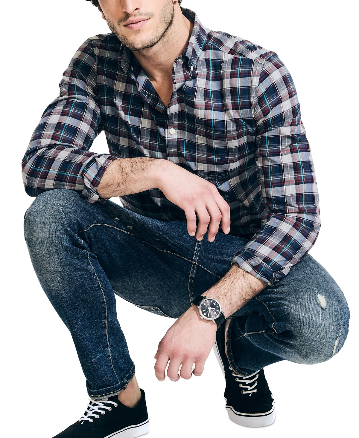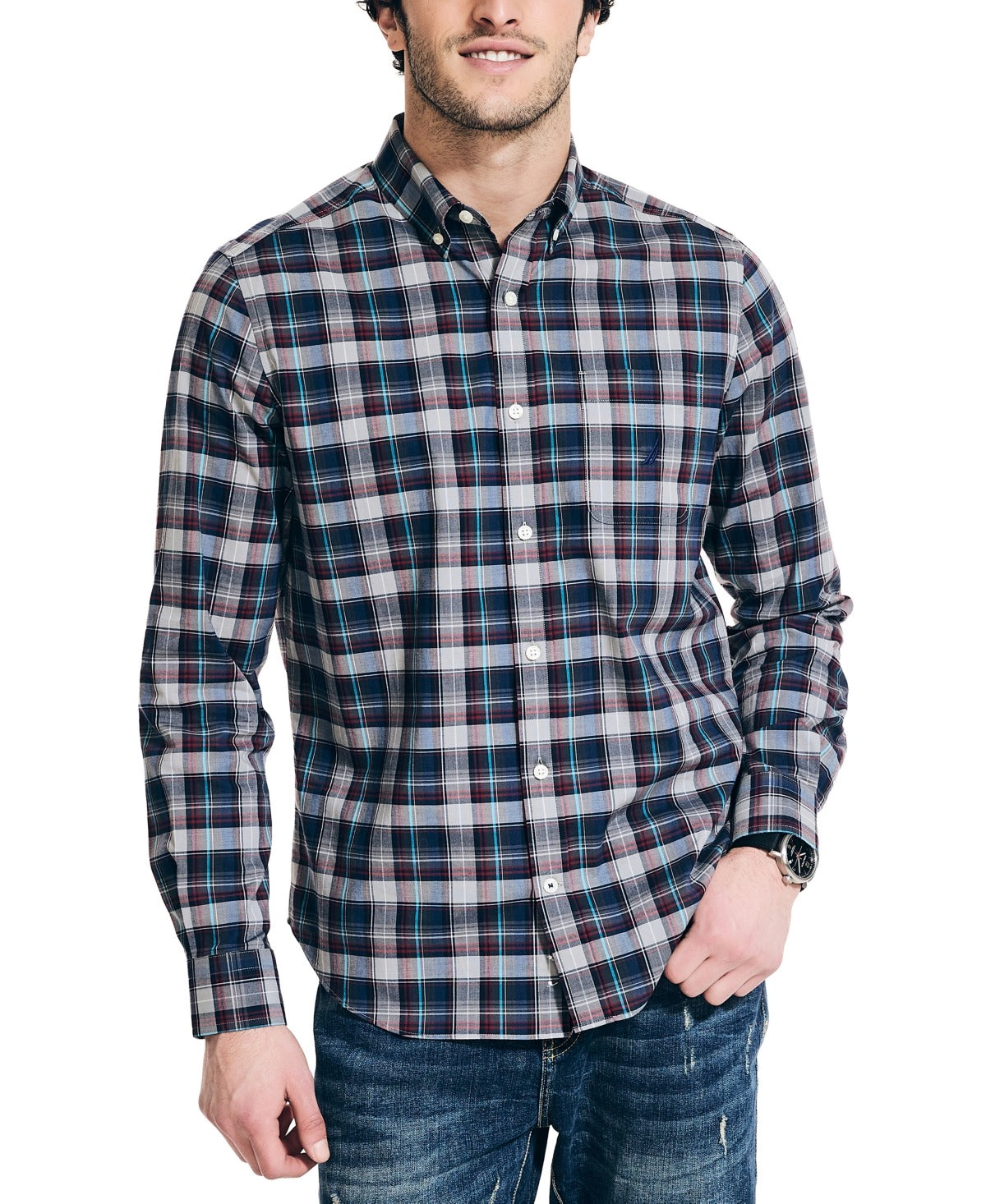 The Nautica Men's Classic Fit Button Down Plaid Shirt in Griffin Grey offers timeless style and versatility. Made with high-quality materials, this shirt features a classic plaid pattern in a neutral grey color, making it easy to pair with jeans or dress pants for a polished look. The classic fit ensures comfort and a flattering silhouette. Perfect for a casual day out or a business casual work environment.
