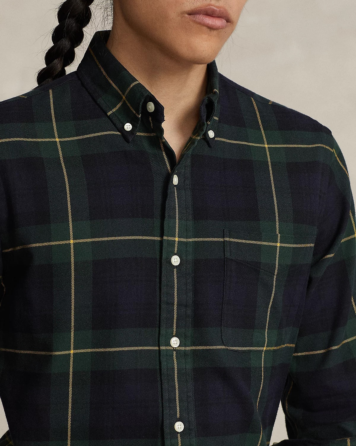 Stay stylish and comfortable with the Polo Ralph Lauren Cotton Flannel Plaid Custom Fit Button Down Shirt. Crafted from soft, breathable cotton flannel, this shirt features a classic plaid pattern and a custom fit for a flattering silhouette. Perfect for layering or wearing on its own, it's a versatile wardrobe essential that effortlessly blends casual and polished style. Upgrade your look with this timeless piece from Polo Ralph Lauren.