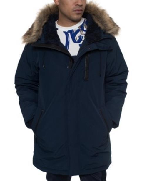Sean John Men's Faux Fur Trimmed Three-Quarter Snorkel Coat Small Navy Blue
