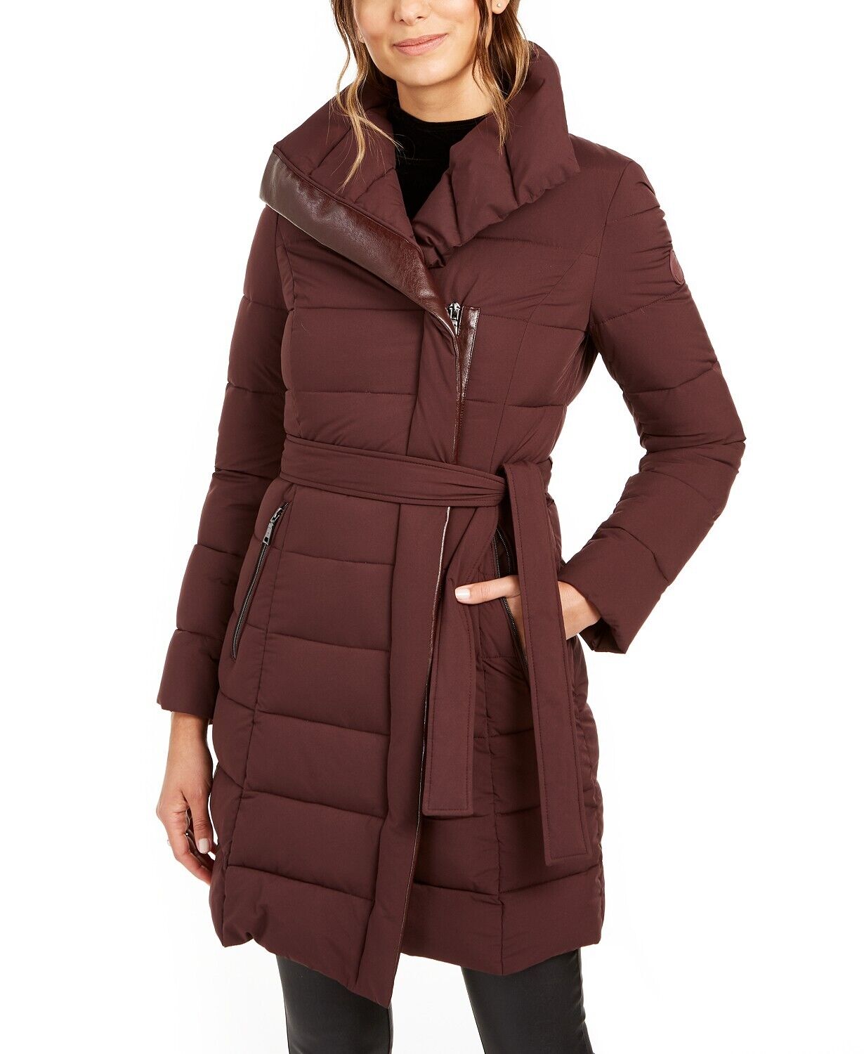 Tahari Womens Asymmetrical Belted Puffer Coat Large Burgundy Red