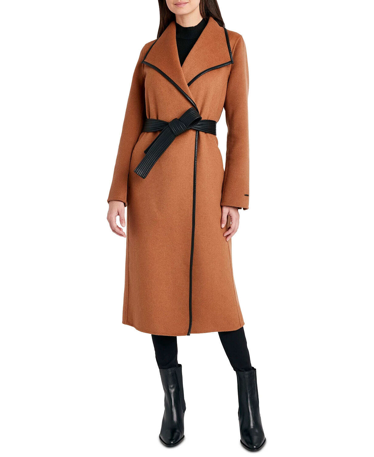 A sleek faux-leather belt highlights this stunning wrap coat from Tahari, designed with an open front that's trimmed in more gorgeous faux leather.
