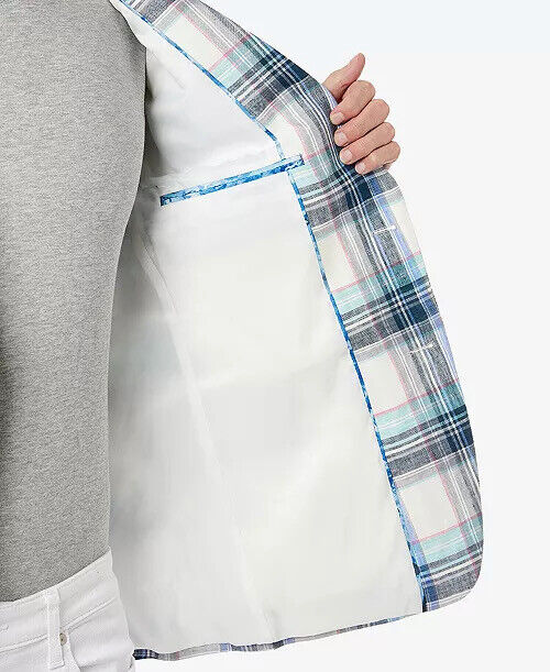 TALLIA Men's Slim-Fit Multicolor Plaid Blazer Blue 40L Sport Coat Linen