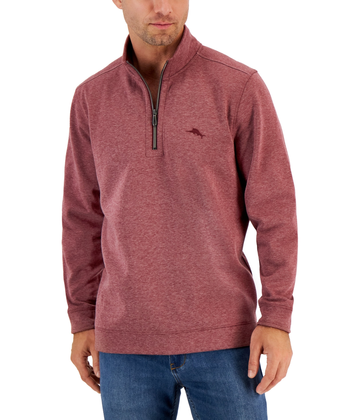The Tommy Bahama Men's Embroidered 1/2-Zip Sweatshirt in Meritage Wine Heather combines style and comfort effortlessly. This sweatshirt features a half-zip design that allows for easy temperature regulation. Made from soft material, it ensures supreme comfort throughout the day. The rich meritage wine heather color adds a touch of sophistication and versatility to any outfit. The embroidered details add a refined and stylish twist, making it suitable for casual or slightly dressier occasions. Perfect for layering or wearing on its own, this sweatshirt is a must-have essential for the fashion-conscious man.