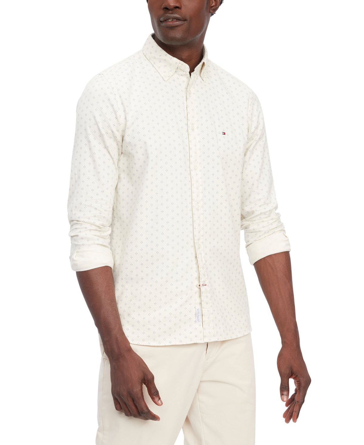 Add a modern twist to your wardrobe with this Tommy Hilfiger Men's Flex Slim-Fit Brushed Twill Printed Shirt in Ecru and Ultra Blue. Made from soft brushed twill fabric, this shirt offers a slim fit silhouette with added stretch for comfort. The unique printed design adds a pop of color to your outfit, making it perfect for both casual and dressy occasions. Great for pairing with jeans or chinos, this shirt is a versatile and stylish addition to any man's closet.