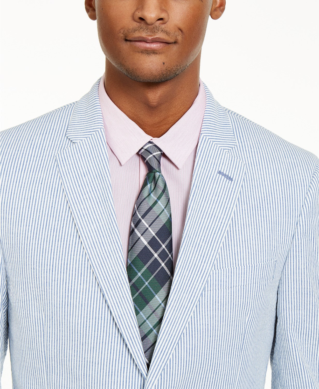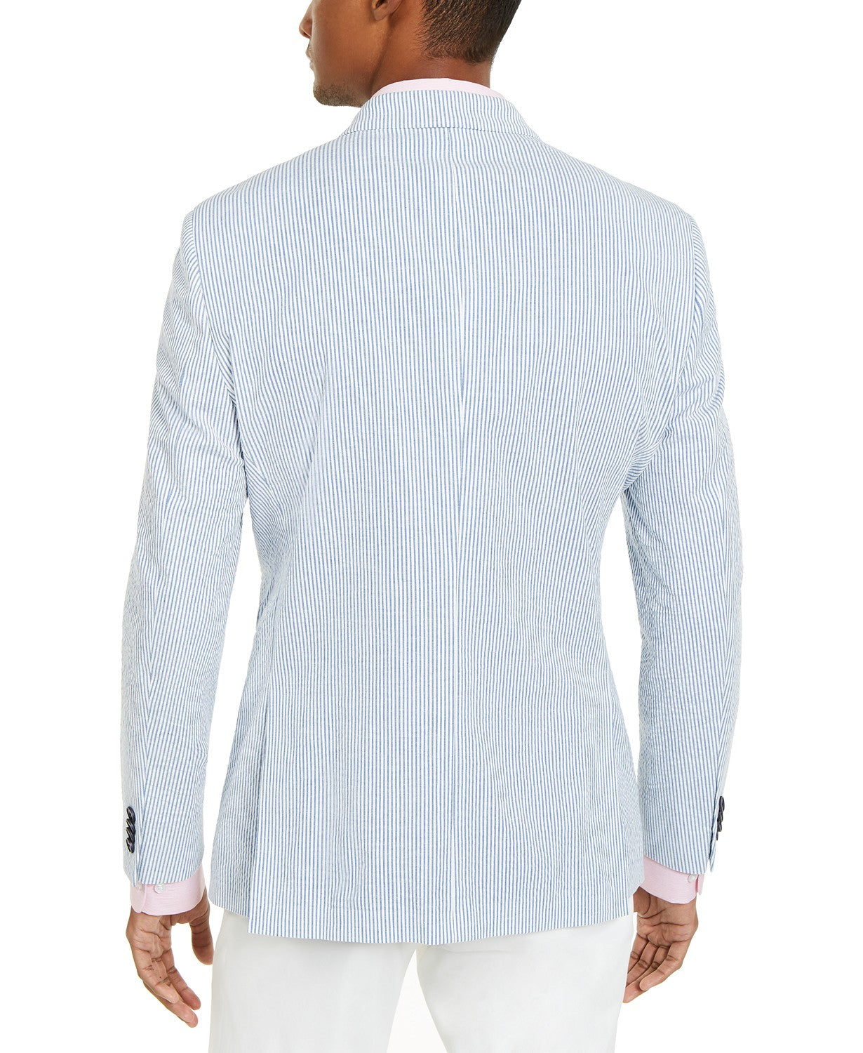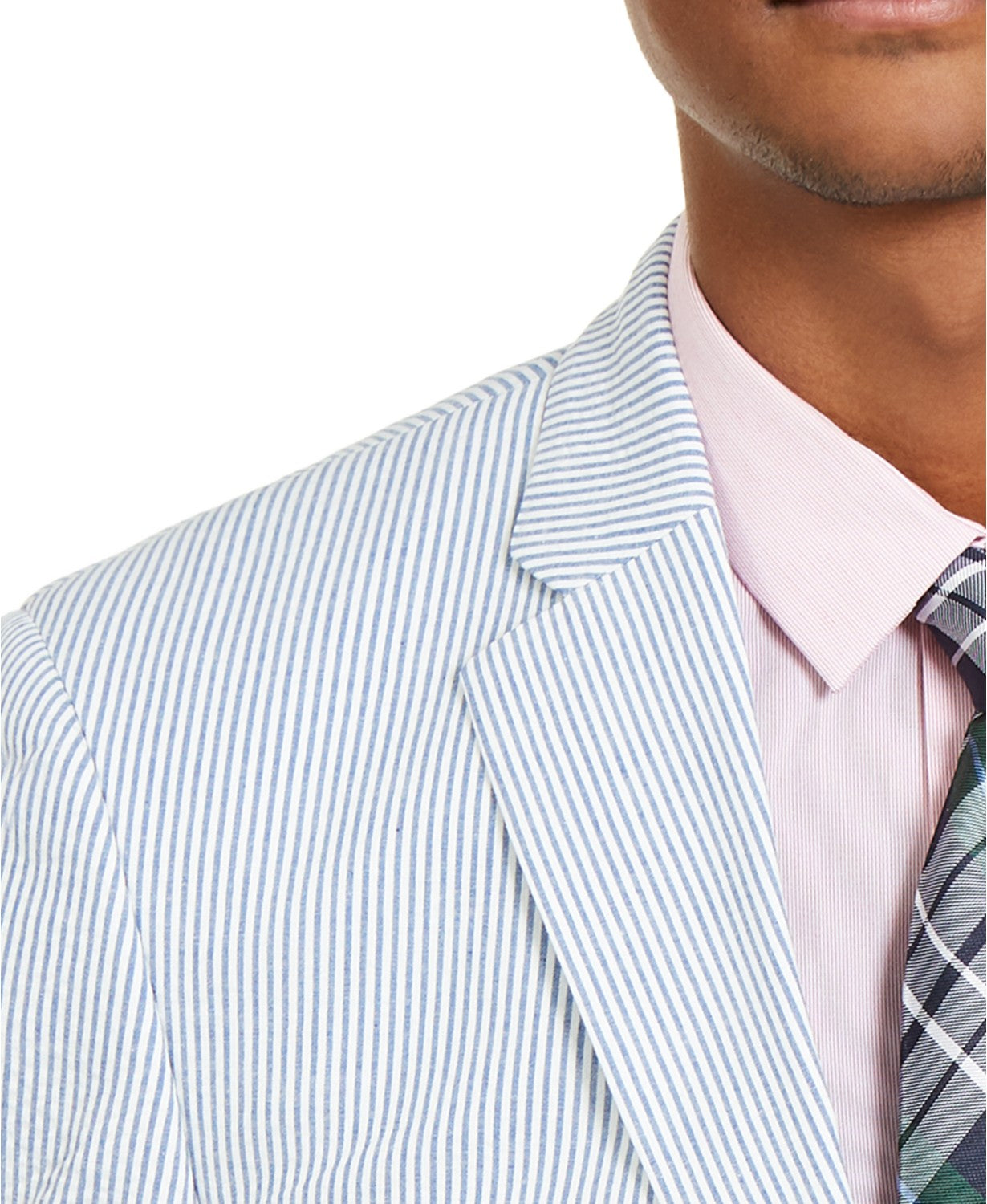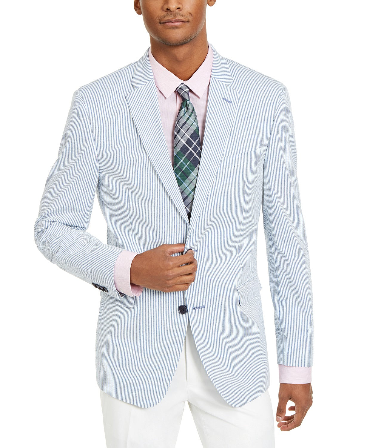 In crisp seersucker enhanced with classic stripes and a touch of stretch for an unrestrictive feel, this modern-fit sport coat from Tommy Hilfiger is the perfect choice for style and comfort in sunny sophisticated settings.