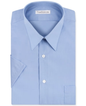 Look sharp and polished in this Van Heusen Men's Short Sleeve Dress Shirt. The regular fit and solid cameo blue color make it a versatile addition to your wardrobe. Made from soft and breathable poplin fabric, this shirt is perfect for both casual and formal occasions. Complete with a classic button-up design, it will keep you looking stylish and comfortable all day long.